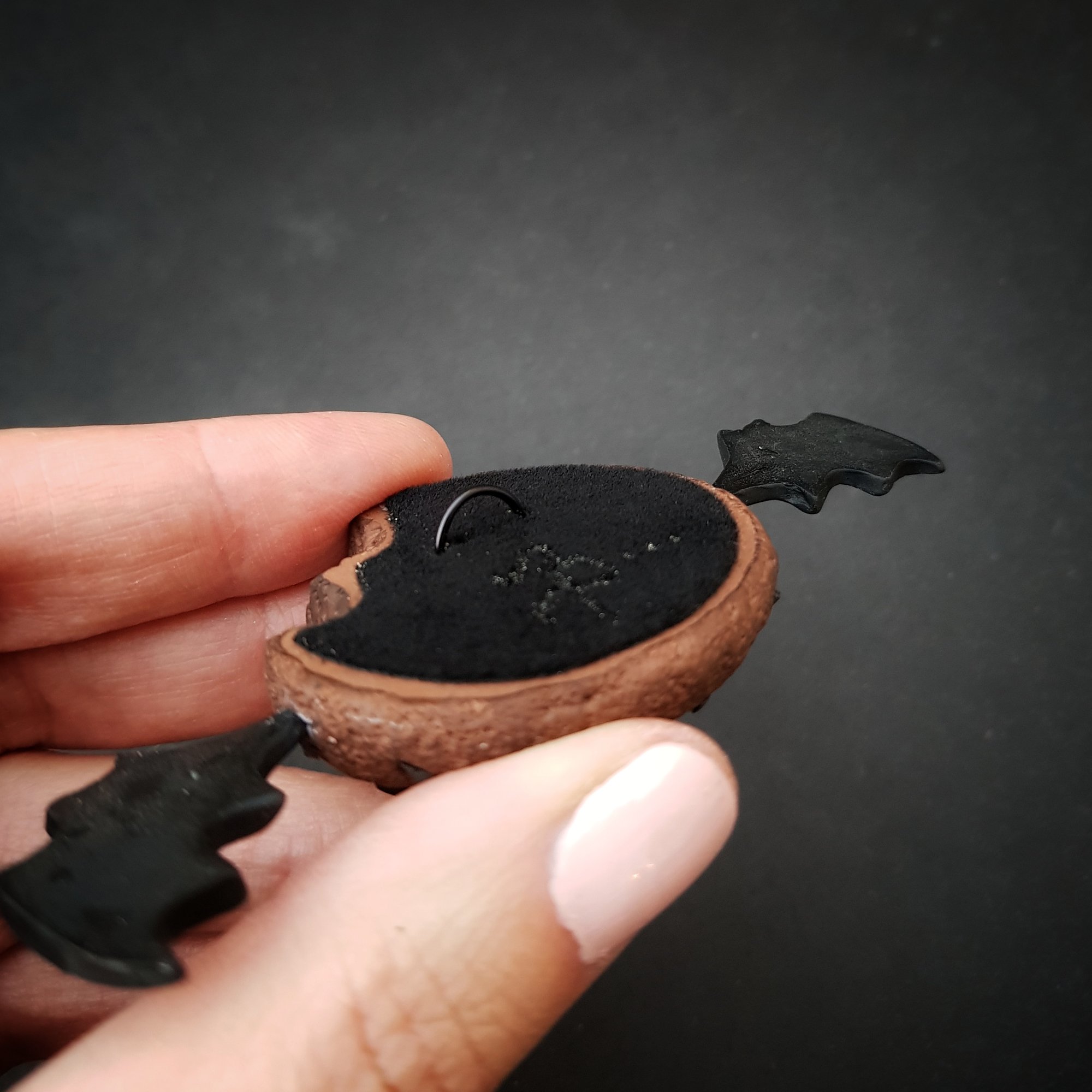 Made of clay. With a hanger in the back